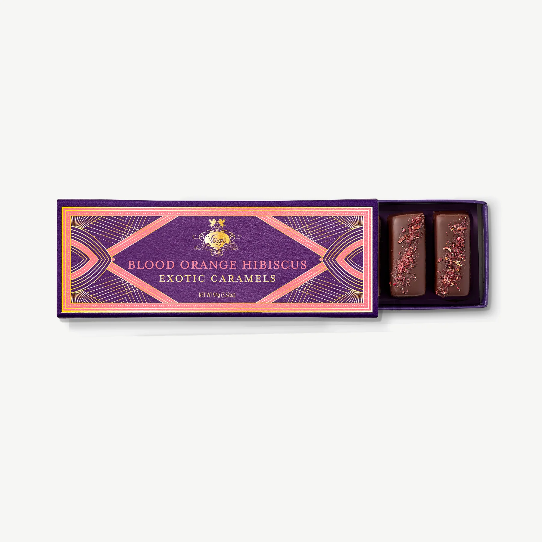 With a soft pull and decadent bite, our Sicilian blood orange caramel is crafted with a bitter orange aperitif infused with 25 aromatic herbs, including wormwood, bitter orange, rhubarb, and hyssop. Each caramel is enrobed in 62% cacao dark chocolate and adorned with hibiscus flowers.