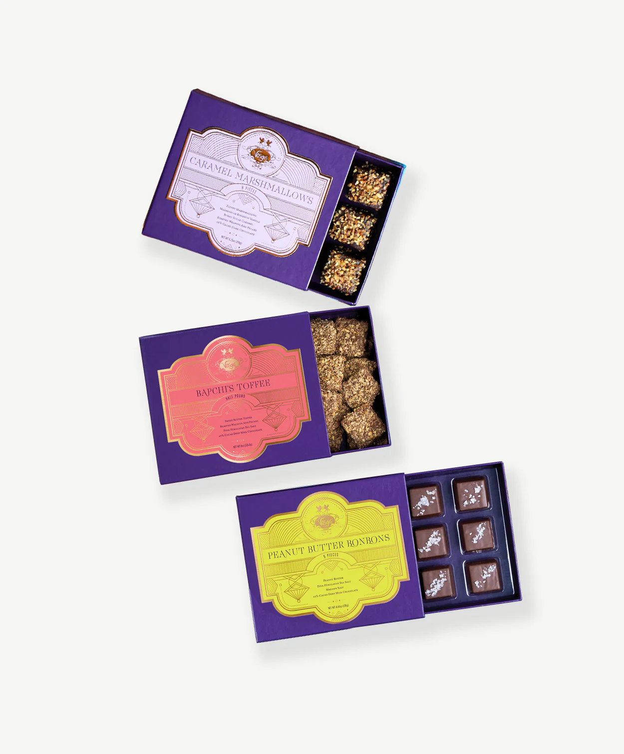 A luxurious twist on the classic comfort foods that everyone loves to indulge in. Fluffy caramel marshmallows, crunchy caramel toffee, and rich peanut butter bonbons are stacked and tied together in an elegant tower with our signature purple ribbon.Ā Why settle for one comfort food favorite when you can indulge in all three?Ā
